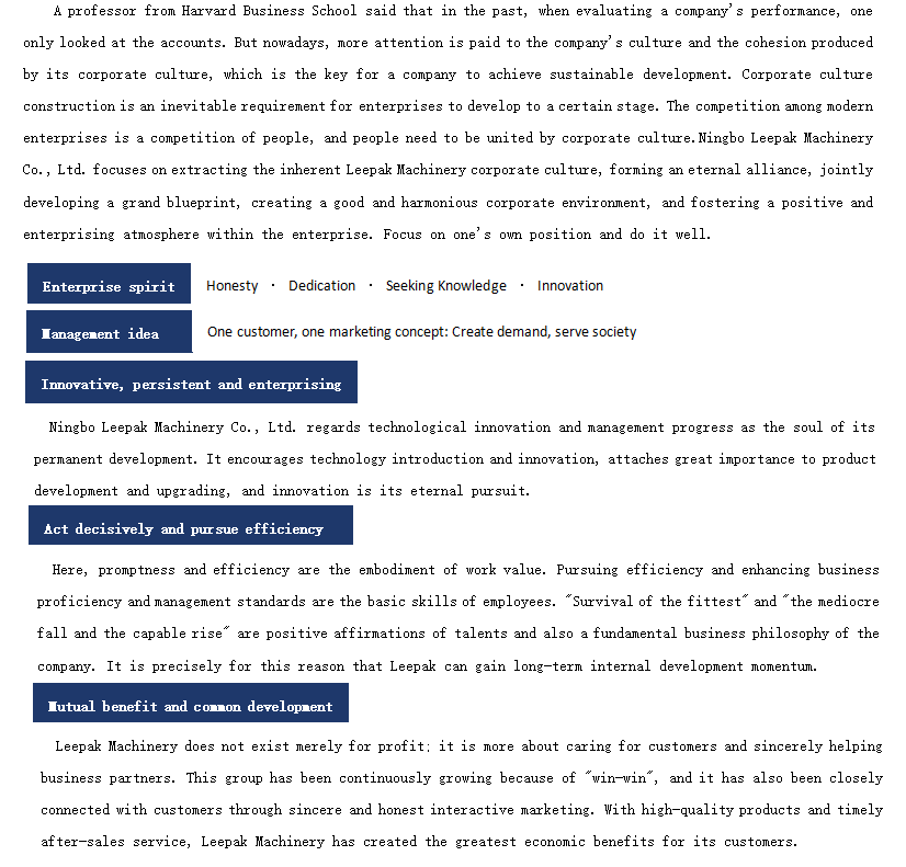 Ningbo Leepak Machinery Co.,Ltd. is a private joint-stock enterprise specializing in the design,development,manufacturing and installation of dairy and beverage packaging machinery and equipment as well as overall engineering projects.
